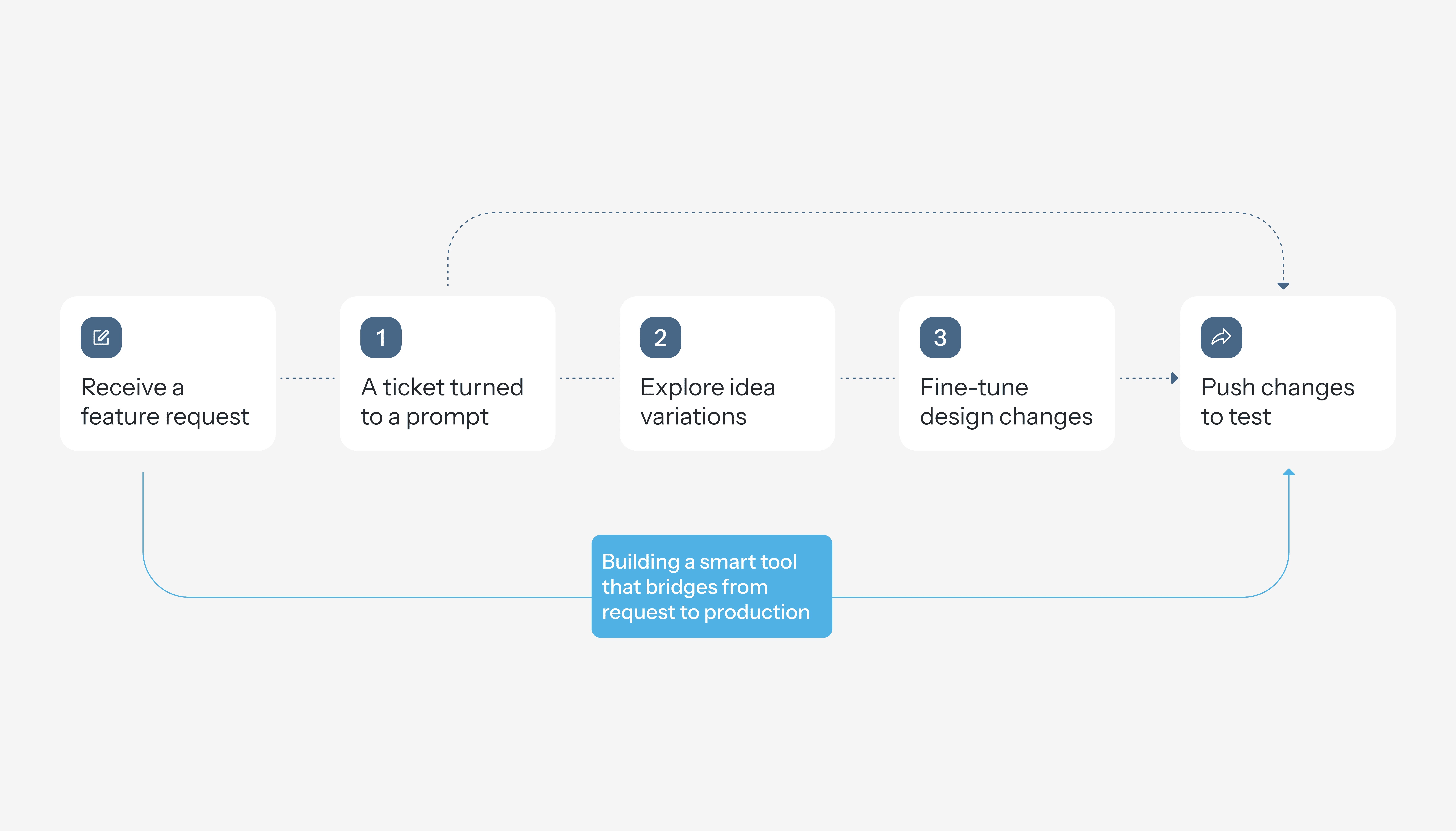 The current product follows a one-sided interaction: users enter prompt and receives a visual feedback. The “prompt-to-response” flow failed to support more complex needs such as iteration variation, the want to integrate research insights, design system request etc.